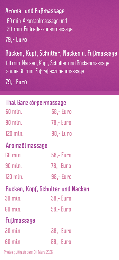 Wir bietet Ihnen in angenehmer, entspannter Atmosphäre die Original traditionelle thailändische Massage. Diese Massage ist in Thailand weit verbreitet und dient dem Lösen von Blockaden und Verspannungen, sowie der Freisetzung körpereigener Energien. Einige Massagen sind schon ab 30 Minuten Anwendungszeit möglich und je nach Wunsch und Bedarf auch miteinander kombinierbar. Geläufige Kombinationen sind im unteren Teil der Preisliste aufgeführt (siehe Paket- und Kombipreise). Wir empfehlen bei den Öl- und traditionellen Thaimassagen Anwendungszeiten ab 60 Minuten damit Sie ausreichend Abstand vom Alltag gewinnen und die Massagen Ihre volle Wirkung entfalten können. Alle Massagen sind selbstverständlich auch als Paarmassagen buchbar. Für eine nachhaltige Wirksamkeit unserer Massagen ist eine gewisse Kontinuität erforderlich, weshalb wir Massagen in Abständen von ca. 7 bis 10 Tagen empfehlen. Zögern Sie nicht uns darauf anzusprechen. Wir beraten Sie gerne.
